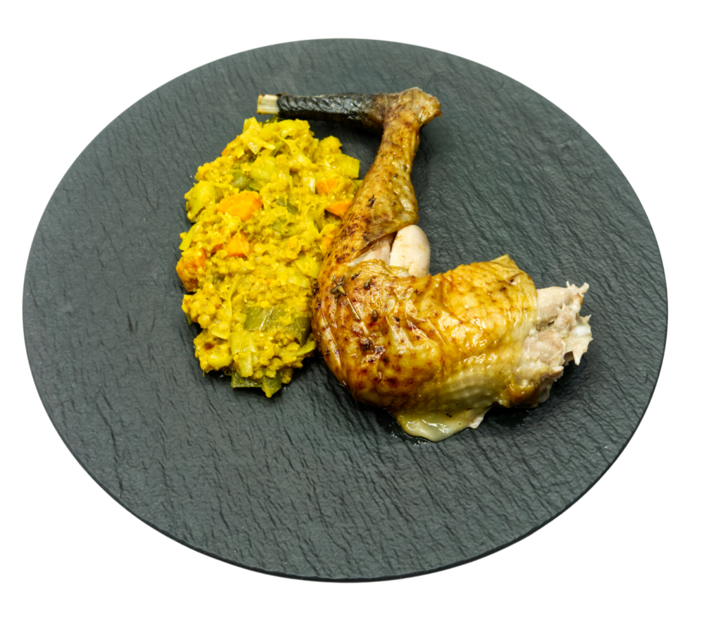Das Linsencurry auf Tellern oder einer großen Platte verteilen. Das Schwarzfederhuhn tranchieren und die Stücke auf dem Curry anrichten. Nach Belieben mit etwas frischem Lavendel oder Zitronenzeste garnieren.