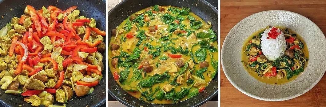 Wenn der Spinat zusammengefallen ist, schmeckst du nochmals ab und das Curry ist fertig. Optimal passt dazu Reis, du kannst aber auch Brot reichen.